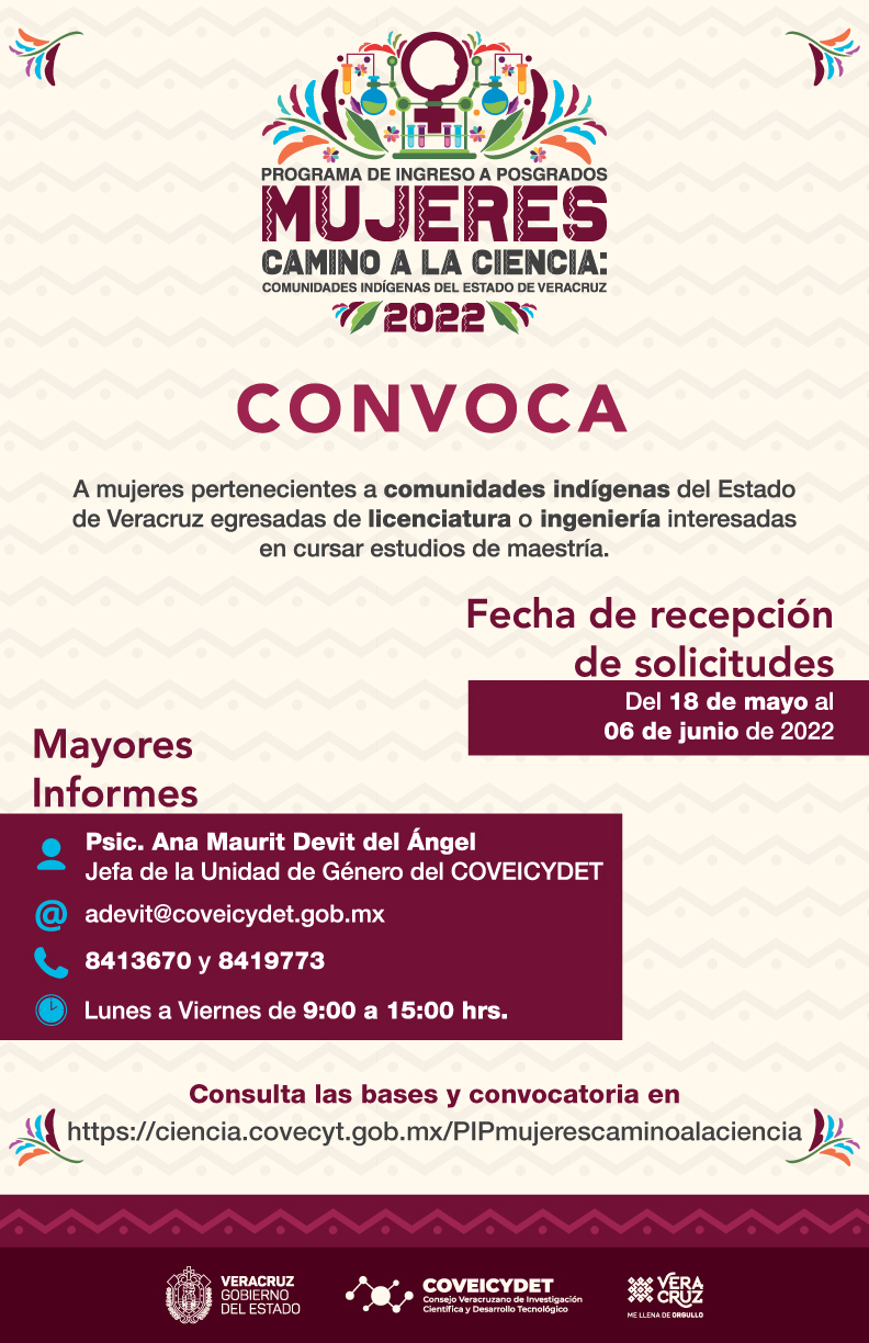 A mujeres veracruzanas egresadas de licenciatura interesadas en realizar estudios de maestría, a participar en el Programa de Ingreso a Posgrados. Mujeres Camino a la Ciencia: Comunidades Indígenas del Estado de Veracruz 2022.